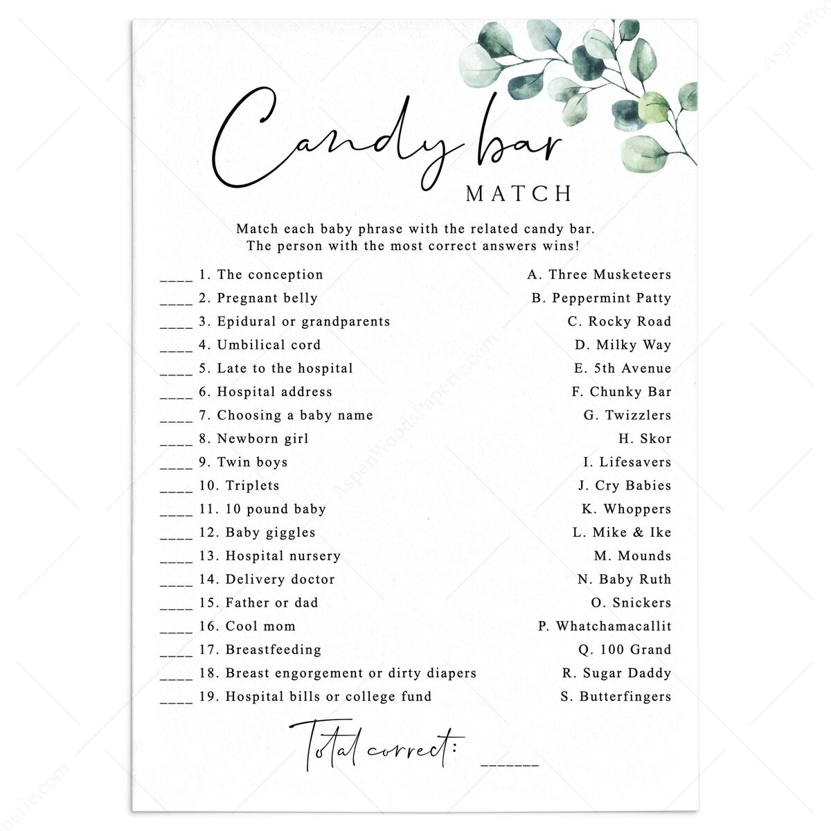 As guests arrive at the baby shower, hand each of them a game card with a list of candy bar names on one side and a blank space to write the corresponding baby-related term on the other side. Throughout the party, guests can mingle and chat while trying to match the candy bars with the baby-related terms. The person with the most correct matches at the end of the game wins a prize!