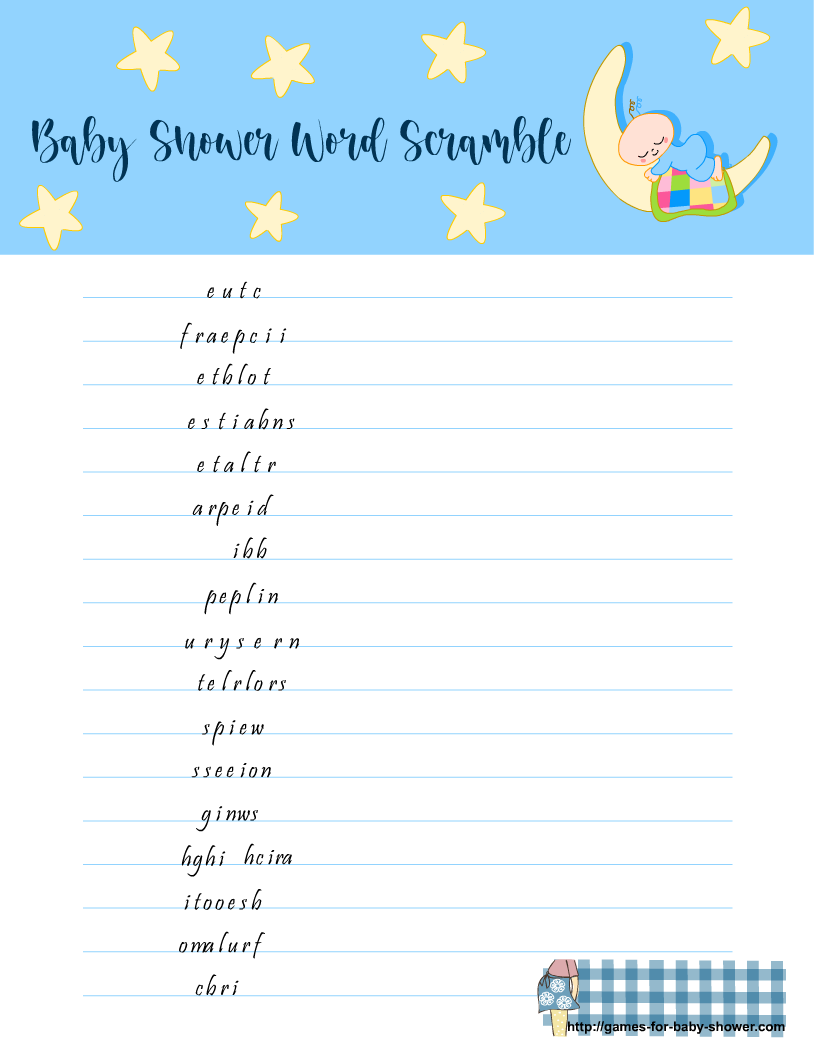 2. Baby Word Scramble: Test your guests’ knowledge of baby-related terms with this entertaining game. Print out a list of scrambled words like “diaper,” “crib,” and “bottle.” Guests must unscramble the words within a set time limit. The person with the most correct answers wins a prize!