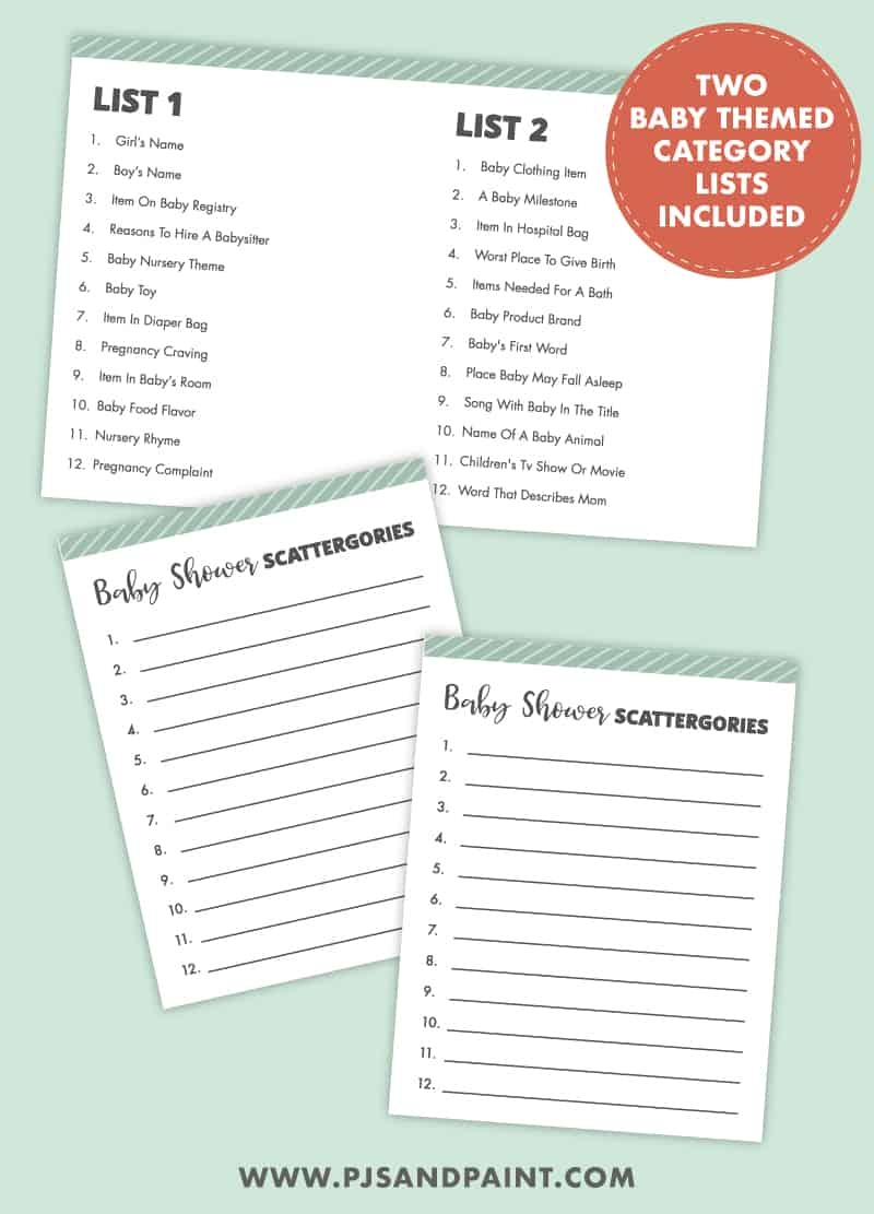 Scattergories is a game where players have to come up with words that fit a specific category and start with a certain letter. It’s a fast-paced and hilarious game that is perfect for baby showers. With our free printable Scattergories cards, all you have to do is download, print, and you’re ready to play!