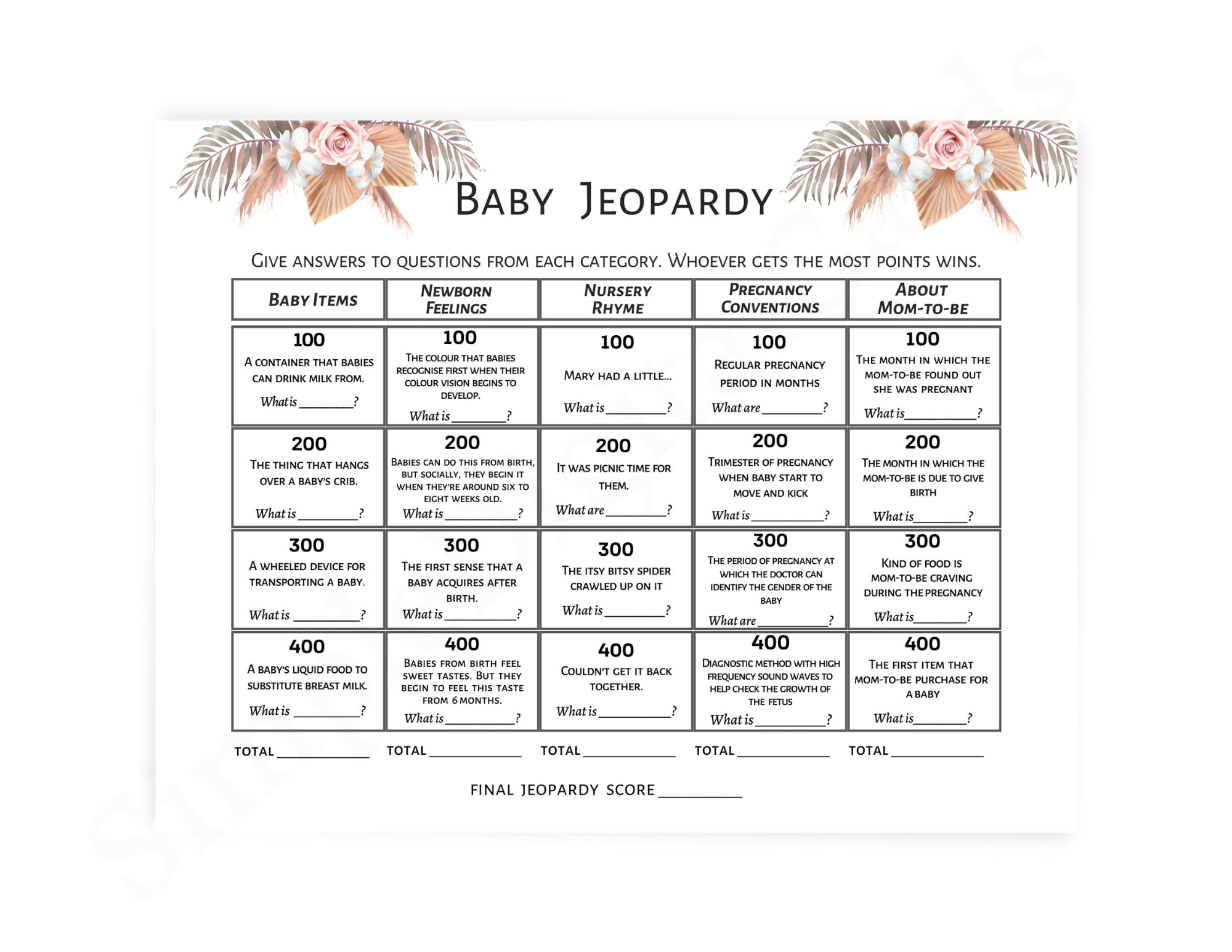 In conclusion, if you’re looking for a fun and interactive game to play at your baby shower, consider hosting a round of Baby Shower Jeopardy. With free printable game cards available online, it’s easy to set up and customize to fit your theme. Your guests are sure to have a blast playing this game and creating lasting memories with the parents-to-be.