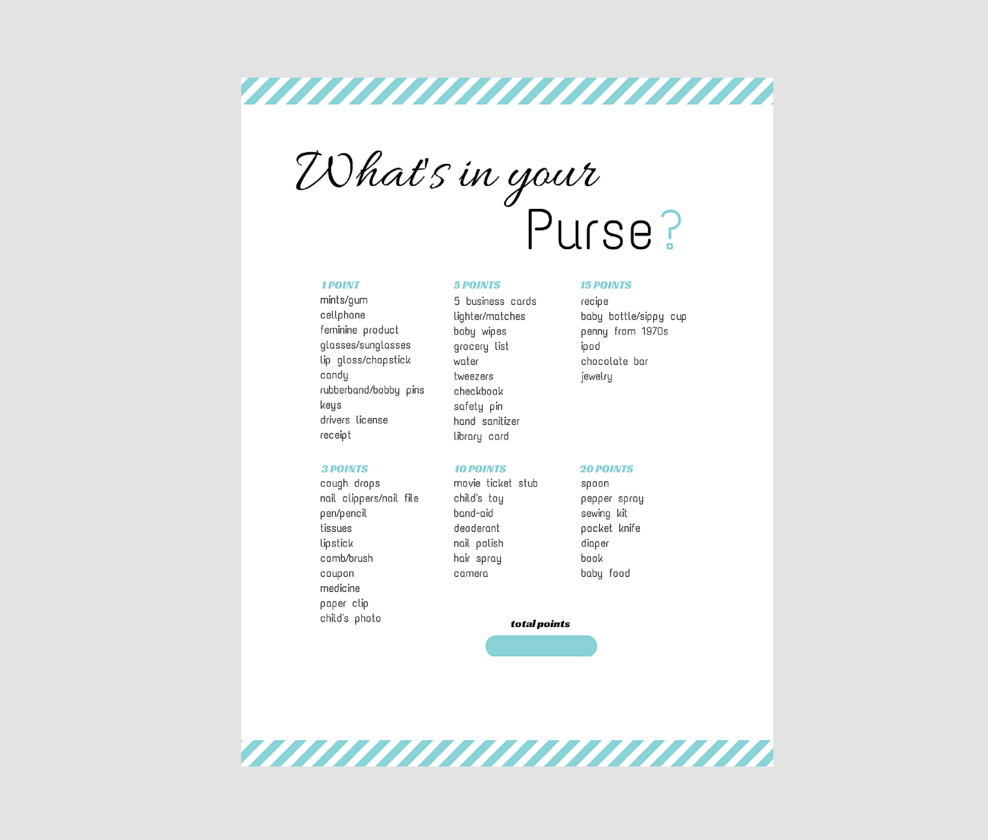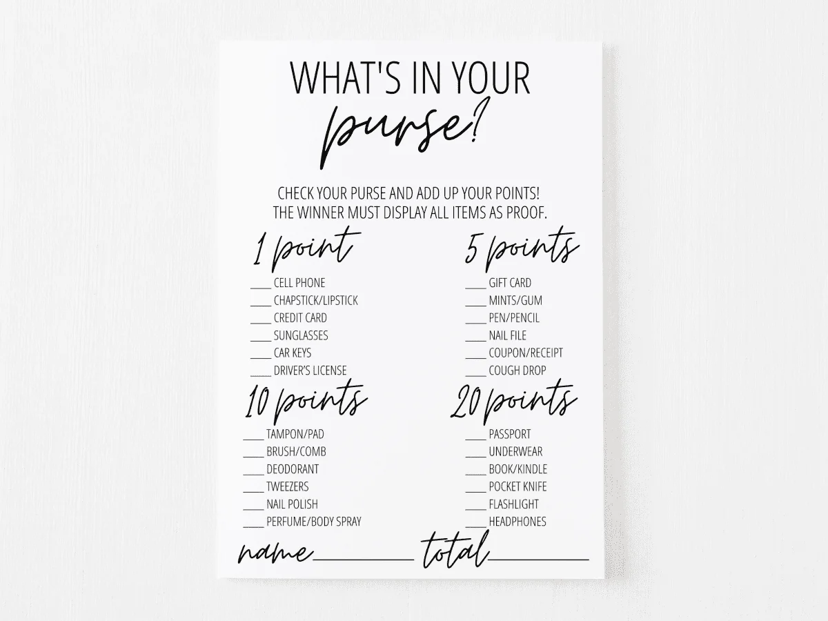 As guests go through their purses, they can tally up their points and see who has the most items on the list. The person with the most points at the end of the game wins a prize. This adds a fun and competitive element to the baby shower, making it a memorable event for everyone involved.