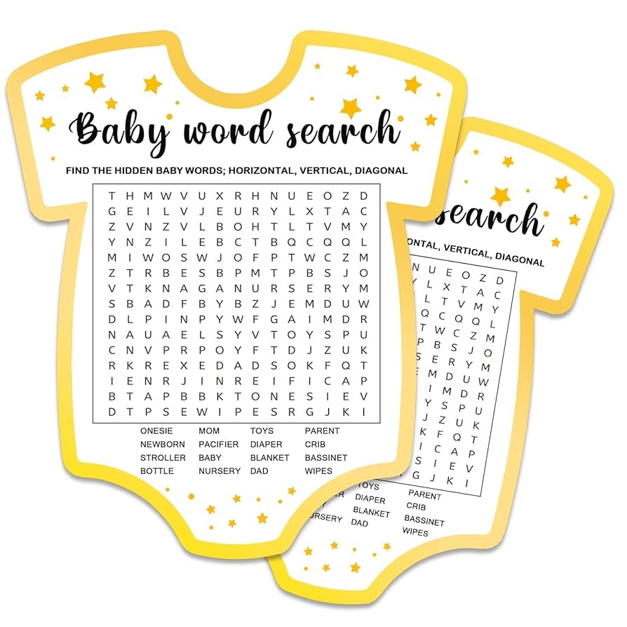 1. Baby Word Search: This classic word find game features words related to babies, such as “diaper,” “pacifier,” “crib,” and “bottle.” Guests can race against each other to see who can find all the words first, adding a competitive element to the game.