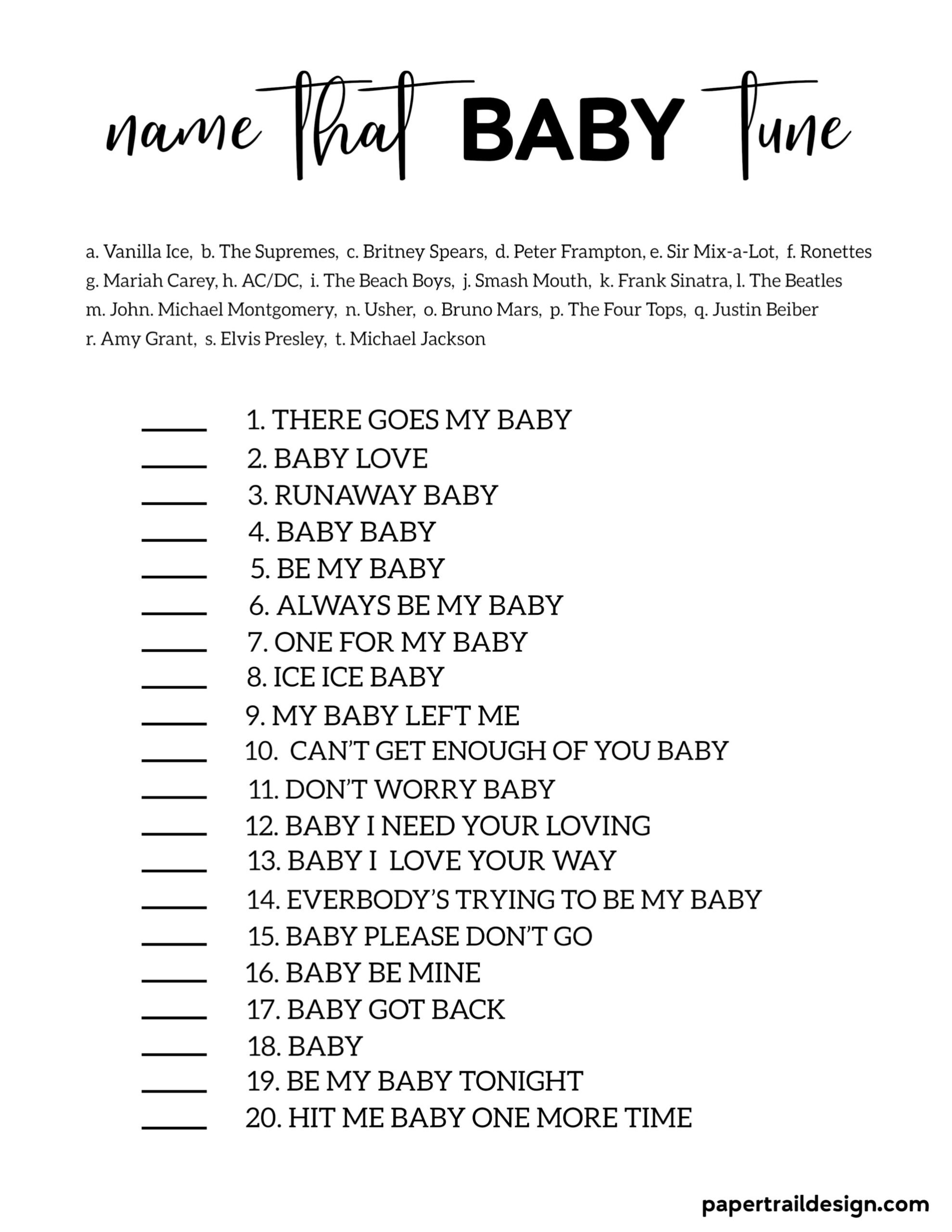 One popular baby song game that you can play with your little one is the “Name That Tune” game. Simply print out a sheet with the titles of different nursery rhymes or children’s songs and play snippets of the songs for your baby to guess. This game is not only fun, but it also helps with your baby’s auditory recognition skills.