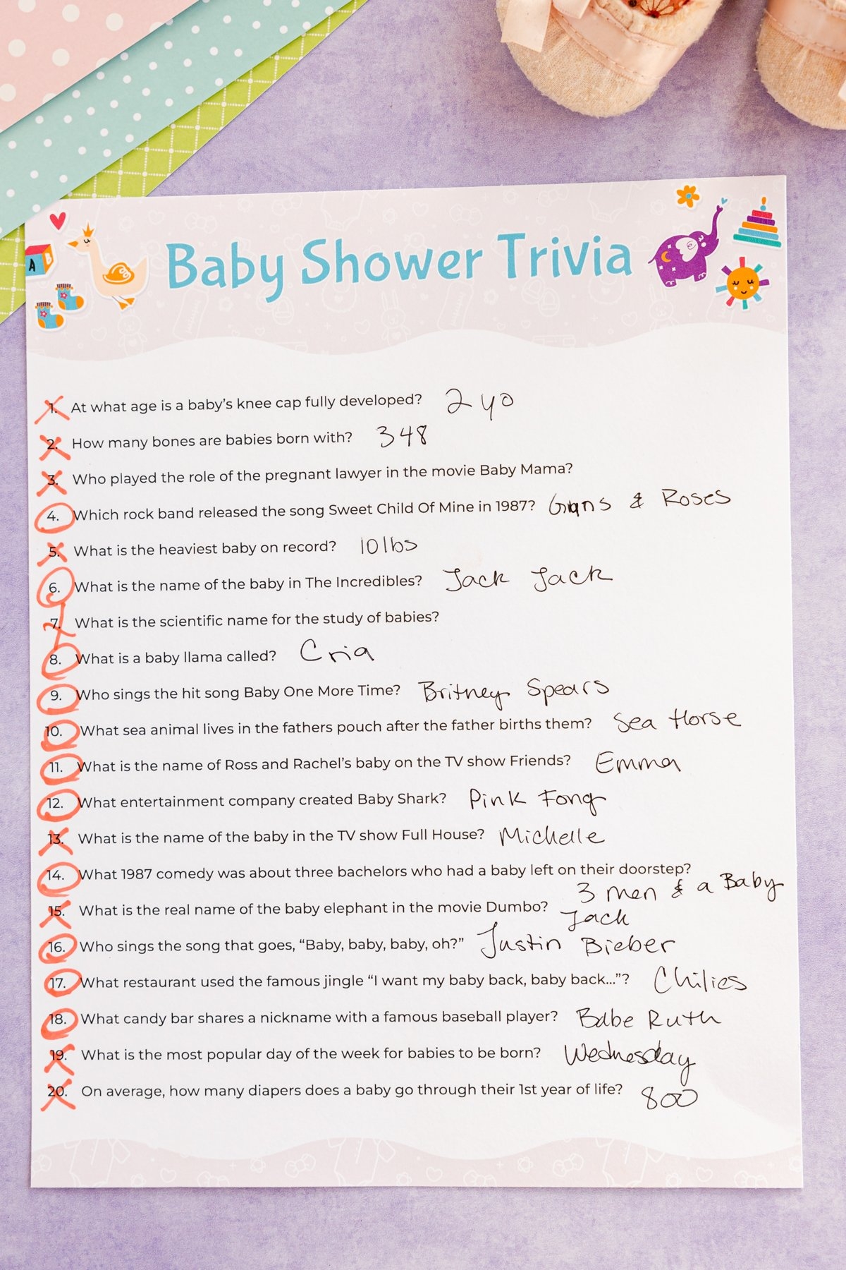 Our free printable baby trivia game includes a variety of fun and challenging questions about babies, pregnancy, and parenting. From celebrity baby names to common baby ailments, there’s something for everyone to enjoy. The answers are also included, so you can easily check how well your guests did at the end of the game.