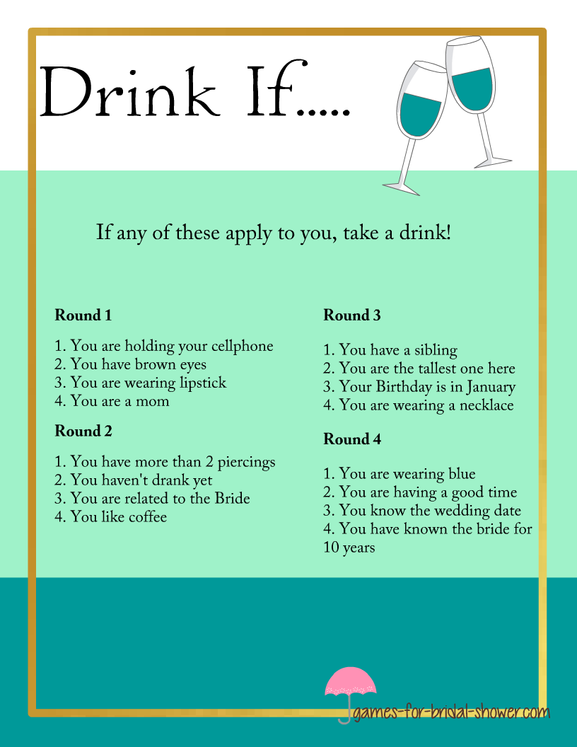3. Drink If…: Create a list of funny and outrageous scenarios for guests to drink if they have ever done them. From “Drink if you’ve ever crashed a wedding” to “Drink if you’ve ever dated two people at once,” this game is guaranteed to get some laughs and maybe even some confessions!