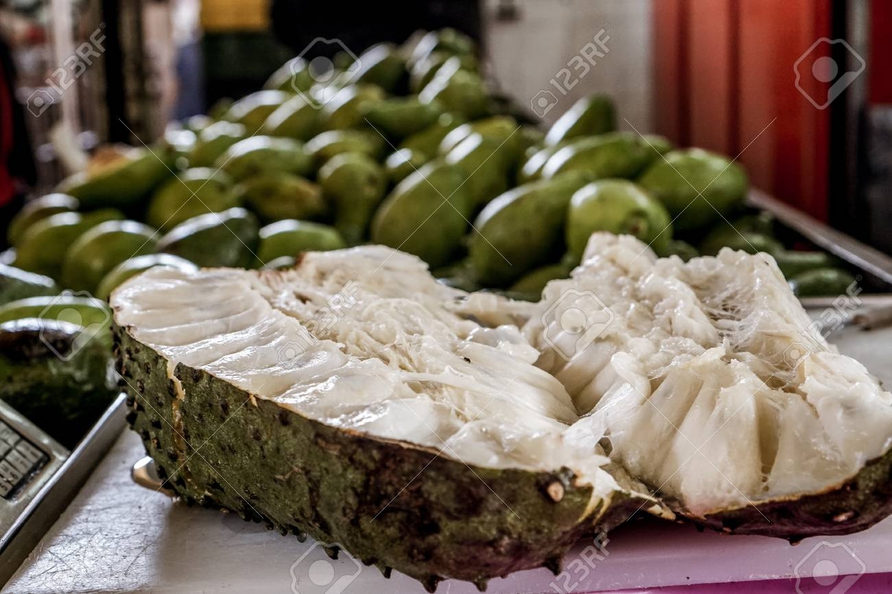 The green, spiky exterior of the guanabana fruit hides a soft, white flesh that is full of flavor. The fruit is often sliced open to reveal its creamy texture and large black seeds.