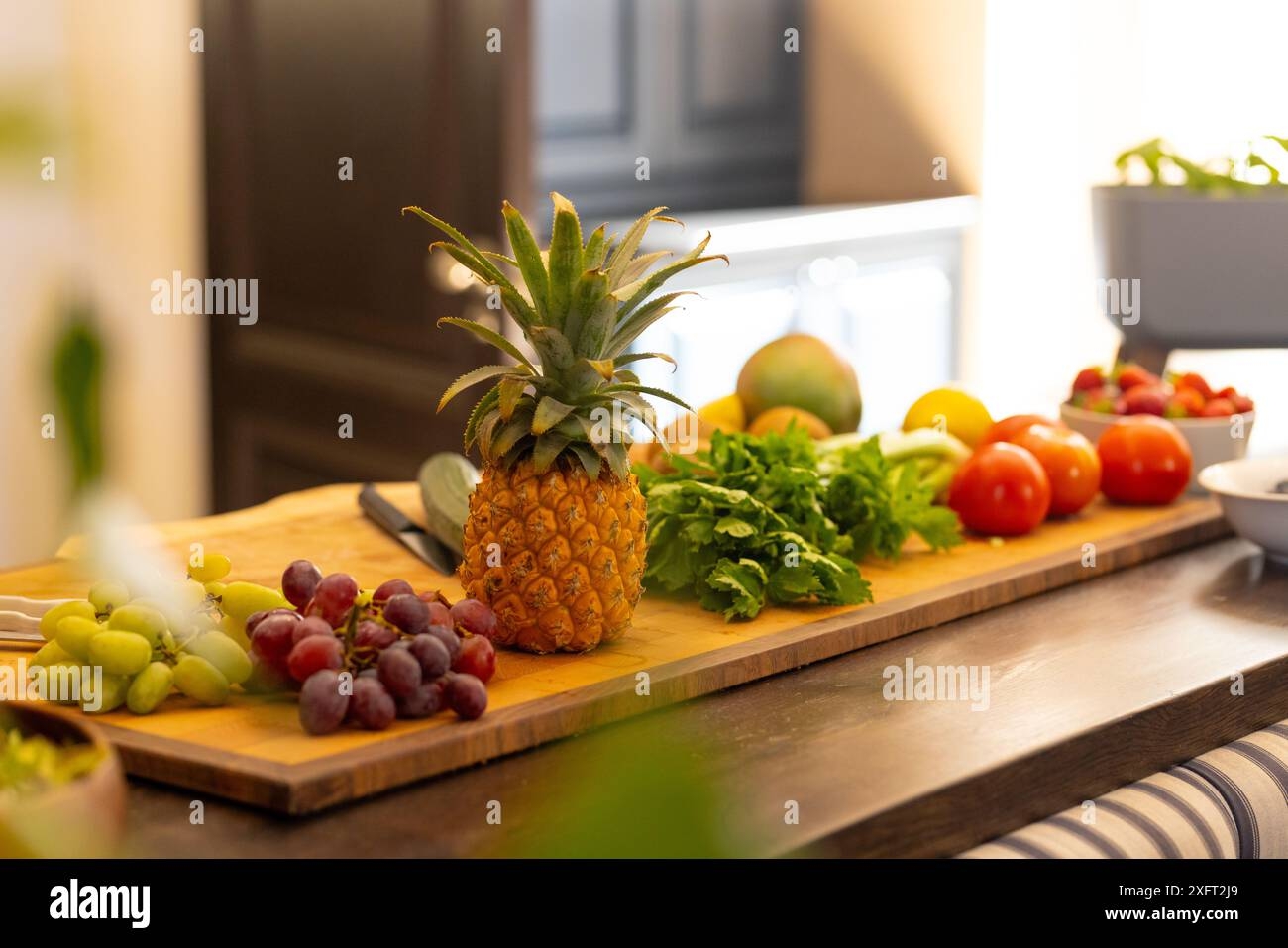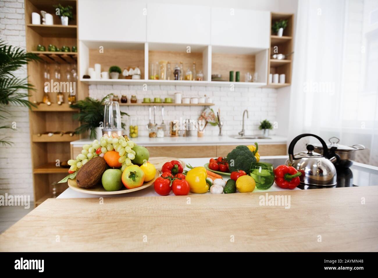 Kitchen Interior Fresh Fruits And Vegetables On Table Stock Photo Alamy
