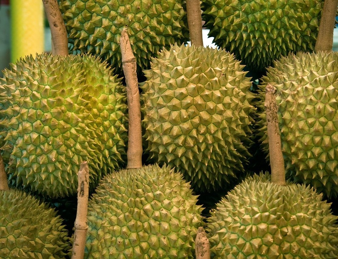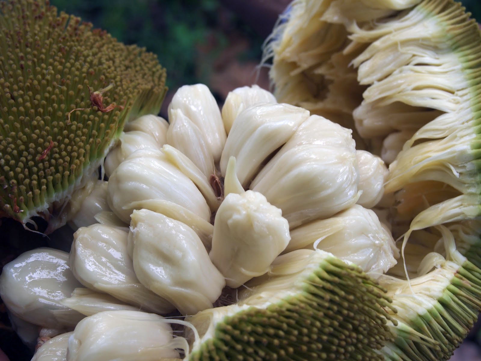 As shown in the picture, the marang fruit has a rough, spiky green skin that encases the creamy white flesh inside. The flesh is divided into segments, each containing a large seed. To eat the fruit, one must carefully remove the skin and seeds, and then enjoy the sweet and flavorful flesh.