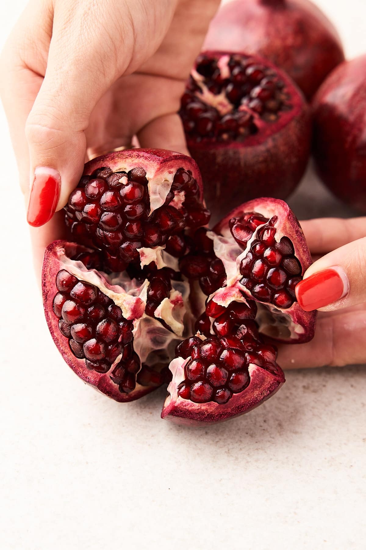 5. Pomegranates: Pomegranates are not only a striking shade of red but also have a unique texture and shape that make them a fascinating subject for photography. Whether they are sliced open to reveal their jewel-like seeds or showcased in a fruit bowl, pomegranates add a touch of elegance and exoticism to any photograph. Their rich red color and intricate details make them a favorite for food stylists and photographers.